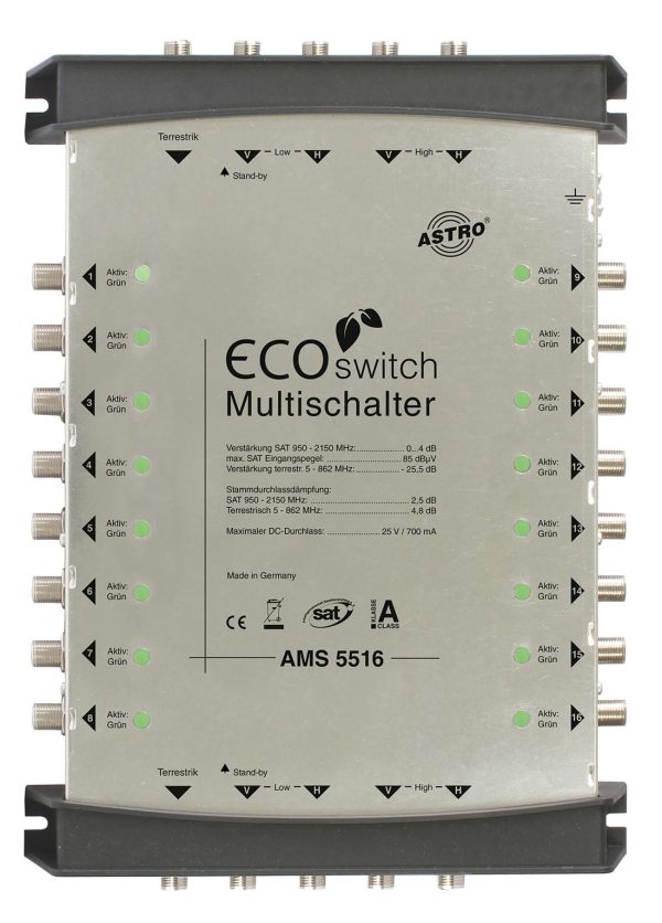 5 inputs for one satellite plus terrestrial, 16 receiver outputs