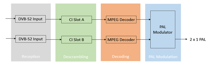 • processing of 2 independent DVB-S2 input signals into 2 PAL output channels in the frequency range 47 to 862 MHz
